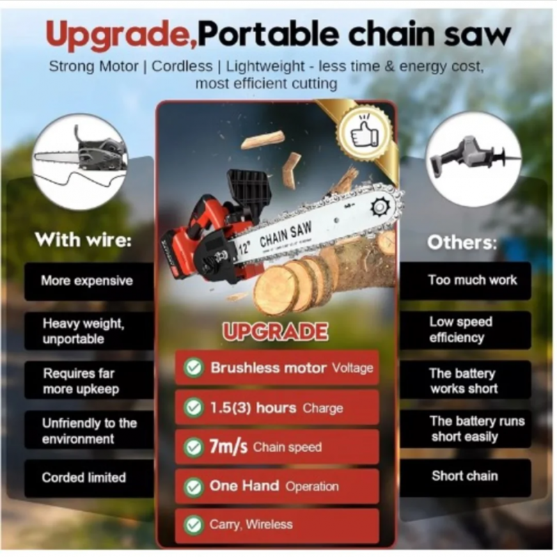 The Lithium-Ion chain Saw is a versatile cutting tool designed for pruning branches and small-scale woodcutting tasks. With its 136v power source, compact 12inch bar, and high chain speed, it offers both convenience and efficiency in various outdoor and woodworking applications. Whether you're a professional arborist or a homeowner looking to maintain your garden or yard, this pruner saw is a valuable addition to your tool collection.