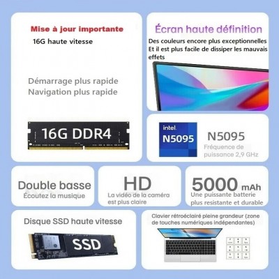 Équipé du processeur Intel N5095 , de 16 Go de RAM, d’un disque SSD rapide de 512 Go , ce PC portable offre une expérience fluide, rapide et agréable, le tout sous Windows 11.